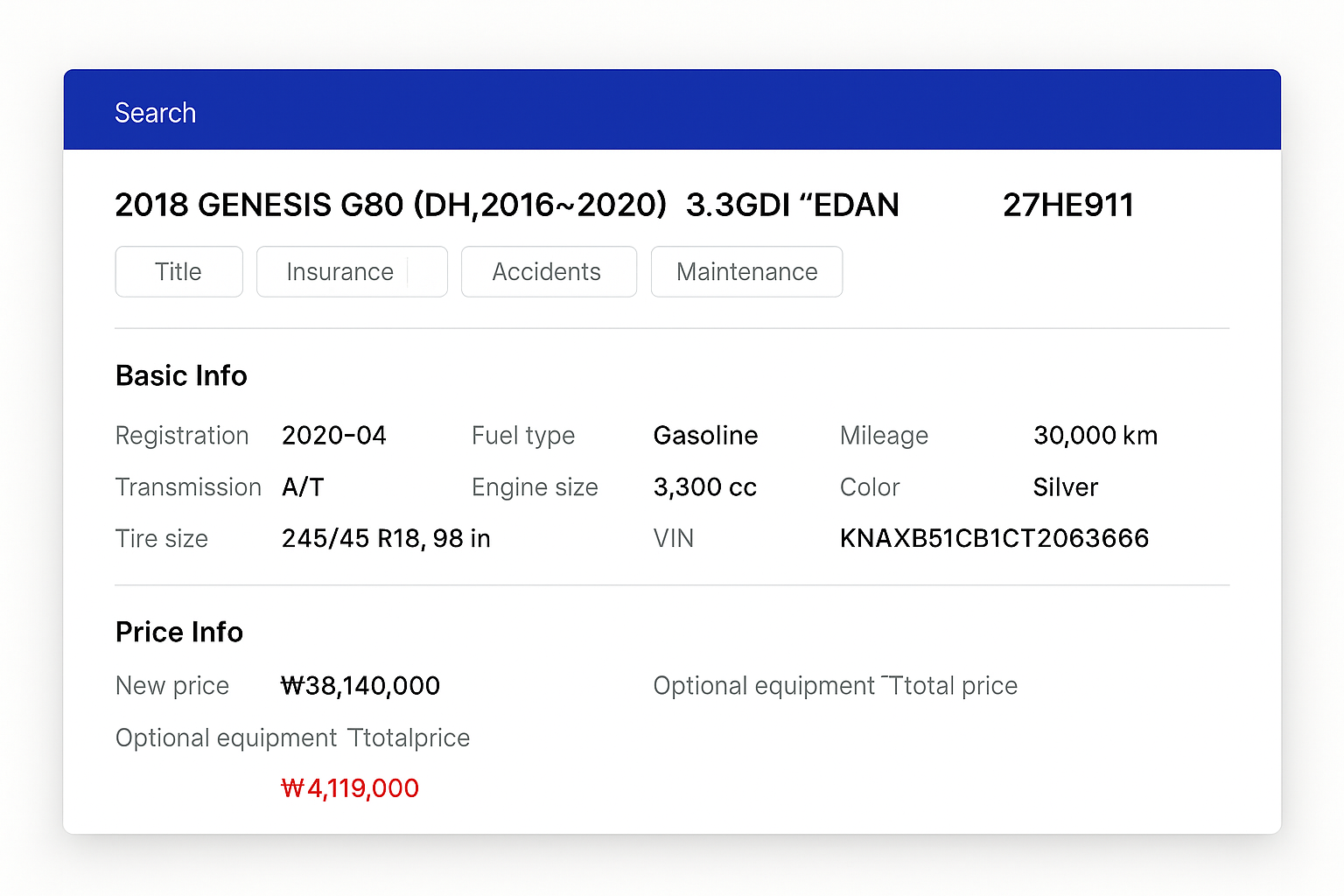 We provide the most reliable and up-to-date data on vehicle specifications, accident history, and maintenance records, sourced from official institutions and certified partners.